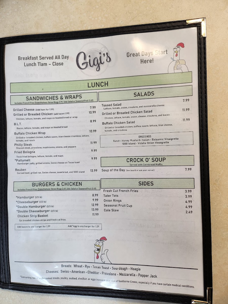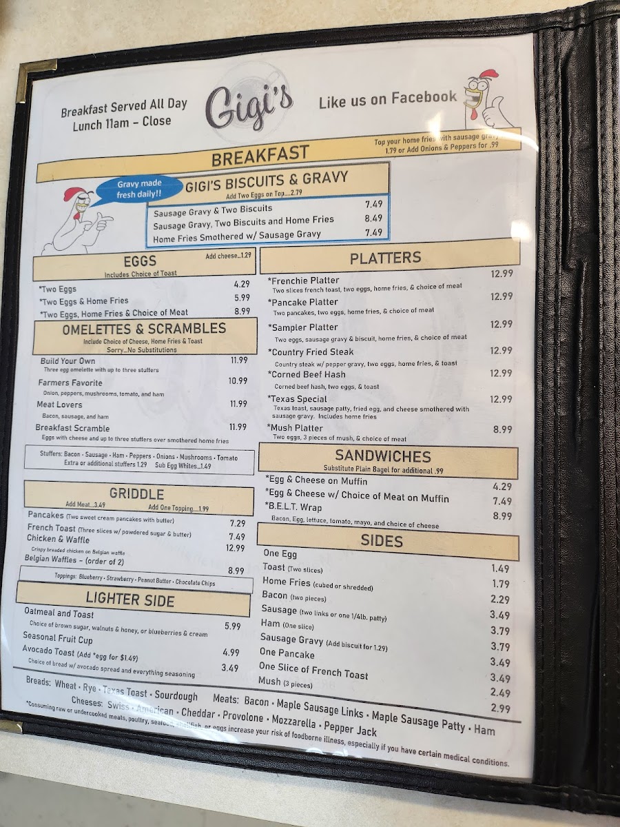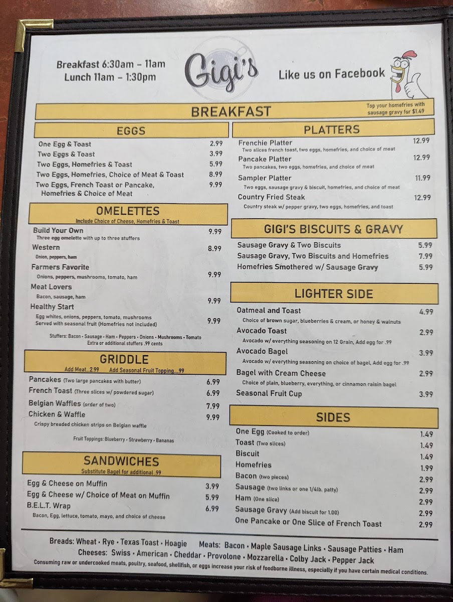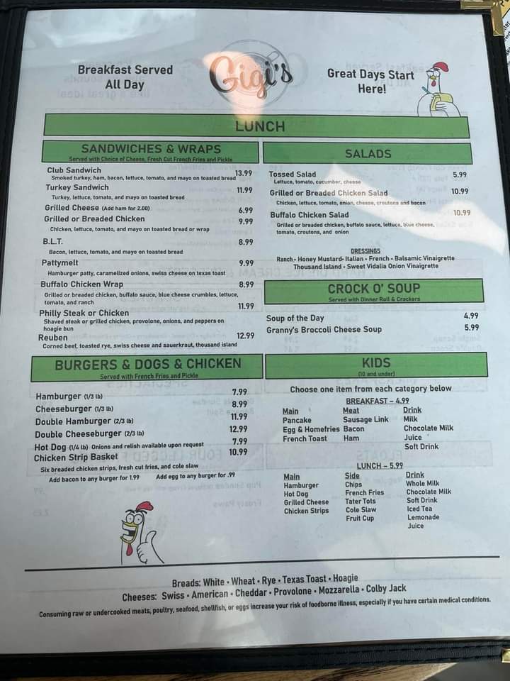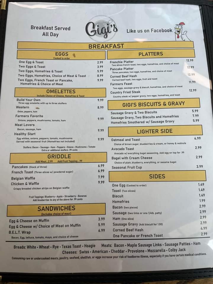 From a reviewer’s perspective, the menu at Gigi's Diner feels like a well-rounded snapshot of classic American diner comfort, thoughtfully spanning breakfast through dinner and even extending to treats for four-legged companions. The variety is impressive: hearty handhelds such as Grilled Cheese, Grilled Or Breaded Chicken, Philly Steak, Fried Bologna, and B.L.T. sit comfortably alongside satisfying classics like the Hamburger, Cheeseburger, Double Hamburger, Double Cheeseburger, and Hot Dog. For something lighter or fresher, options like Tossed Salad, Grilled Or Breaded Chicken Salad, and Buffalo Chicken Salad balance the menu nicely, while sides such as Fresh Cut French Fries, Tater Tots, Onion Rings, Seasonal Fruit Cup, and Cole Slaw complete any meal. Breakfast lovers are especially well served with choices ranging from Loaded Burrito, customizable omelets like Build Your Own and Farmers Favorite, to griddle favorites including Pancakes, French Toast, and Belgian Waffles. Traditional plates such as One Egg & Toast, Two Eggs & Toast, Two Eggs, Homefries & Toast, and indulgent comfort like Sausage Gravy & Two Biscuits reinforce the diner’s homestyle appeal. Lunch and platters-Chicken Philly, Bacon Cheeseburg Wrap, Frenchie Platter, Pancake Platter, Sampler Platter, and Country Fried Steak-add substance and choice, while desserts like Pie, Cheese Cake, and Specialty Cakes provide a fittingly sweet finale. The beverage list, from Hot Brewed Coffee/Tea and Milk to Bloody Mary, Sangria, Bud Light, and Summer Shandy, rounds everything out. Overall, the menu succeeds as a comforting, inclusive conclusion to the Gigi’s Diner experience-familiar, generous, and designed to please nearly every appetite.