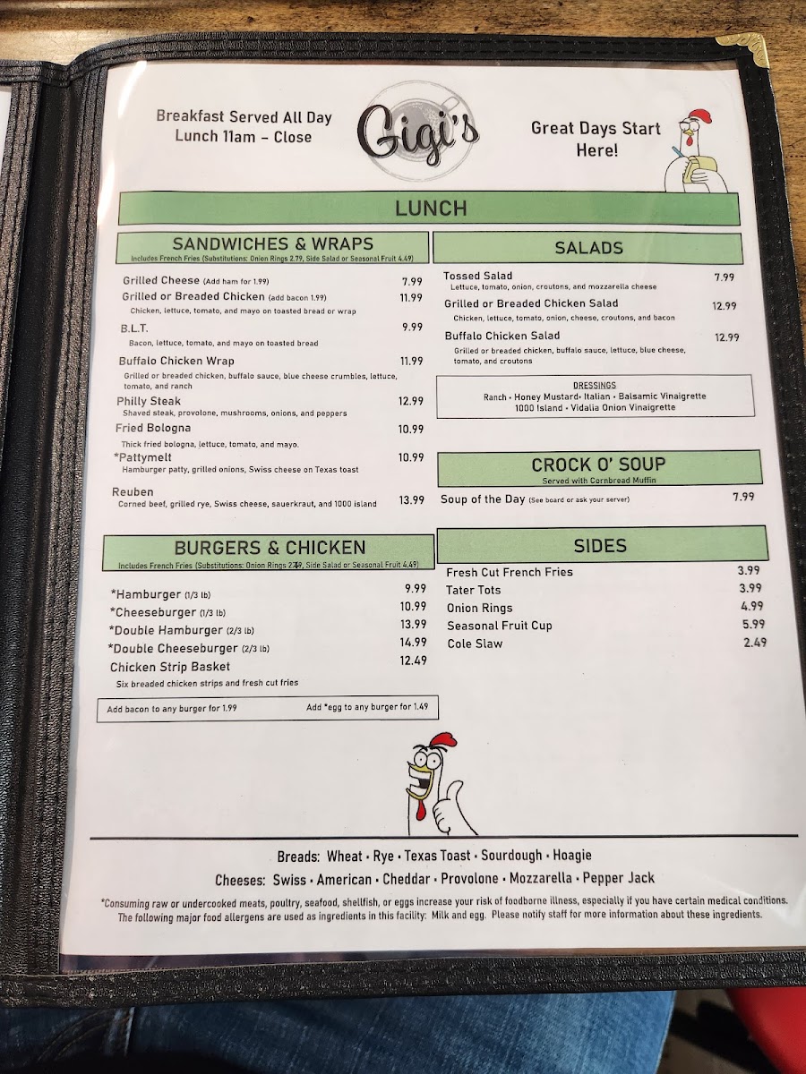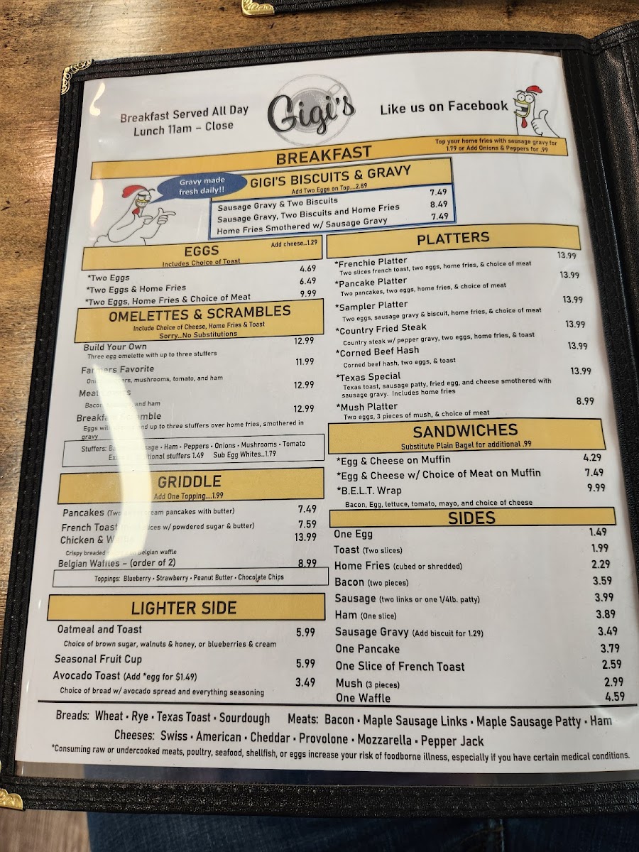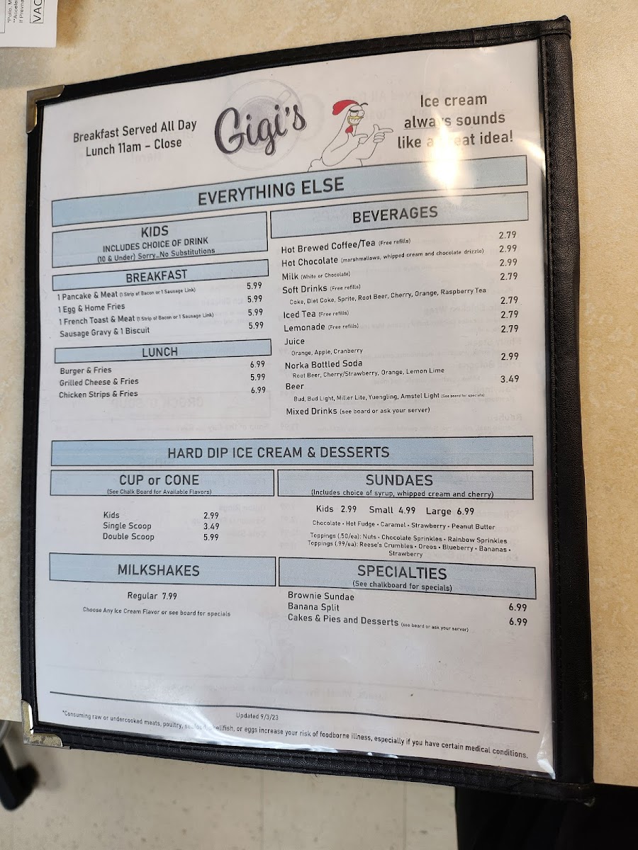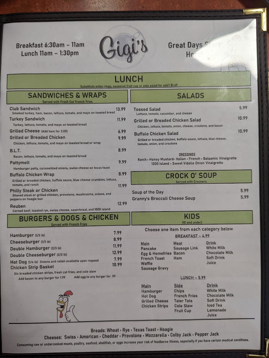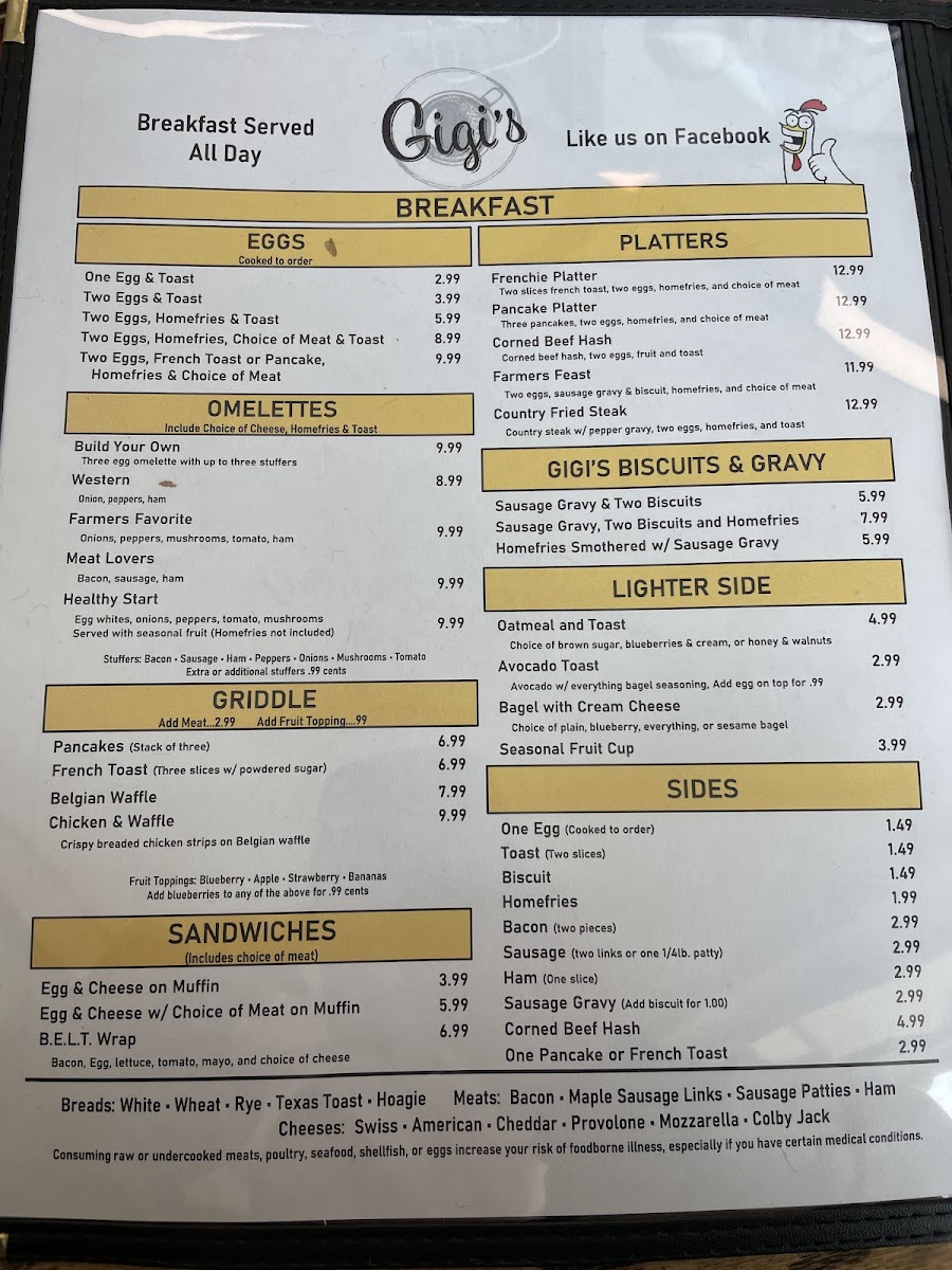 From a reviewer’s perspective, the menu at Gigi's Diner feels like a well-rounded snapshot of classic American diner comfort, thoughtfully spanning breakfast through dinner and even extending to treats for four-legged companions. The variety is impressive: hearty handhelds such as Grilled Cheese, Grilled Or Breaded Chicken, Philly Steak, Fried Bologna, and B.L.T. sit comfortably alongside satisfying classics like the Hamburger, Cheeseburger, Double Hamburger, Double Cheeseburger, and Hot Dog. For something lighter or fresher, options like Tossed Salad, Grilled Or Breaded Chicken Salad, and Buffalo Chicken Salad balance the menu nicely, while sides such as Fresh Cut French Fries, Tater Tots, Onion Rings, Seasonal Fruit Cup, and Cole Slaw complete any meal. Breakfast lovers are especially well served with choices ranging from Loaded Burrito, customizable omelets like Build Your Own and Farmers Favorite, to griddle favorites including Pancakes, French Toast, and Belgian Waffles. Traditional plates such as One Egg & Toast, Two Eggs & Toast, Two Eggs, Homefries & Toast, and indulgent comfort like Sausage Gravy & Two Biscuits reinforce the diner’s homestyle appeal. Lunch and platters-Chicken Philly, Bacon Cheeseburg Wrap, Frenchie Platter, Pancake Platter, Sampler Platter, and Country Fried Steak-add substance and choice, while desserts like Pie, Cheese Cake, and Specialty Cakes provide a fittingly sweet finale. The beverage list, from Hot Brewed Coffee/Tea and Milk to Bloody Mary, Sangria, Bud Light, and Summer Shandy, rounds everything out. Overall, the menu succeeds as a comforting, inclusive conclusion to the Gigi’s Diner experience-familiar, generous, and designed to please nearly every appetite.